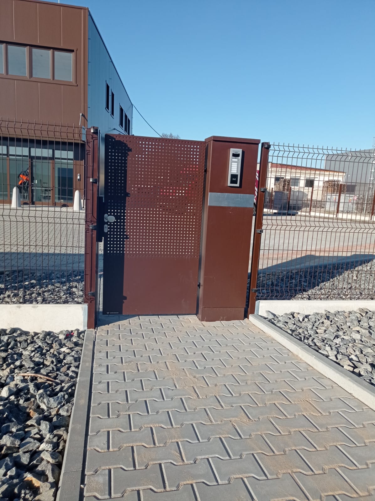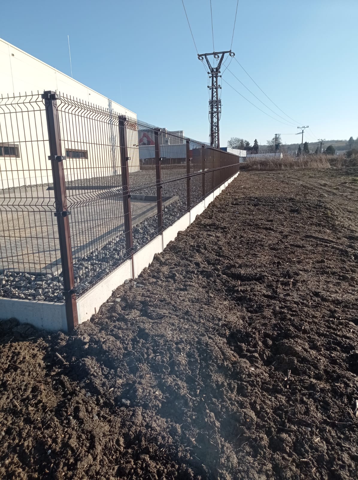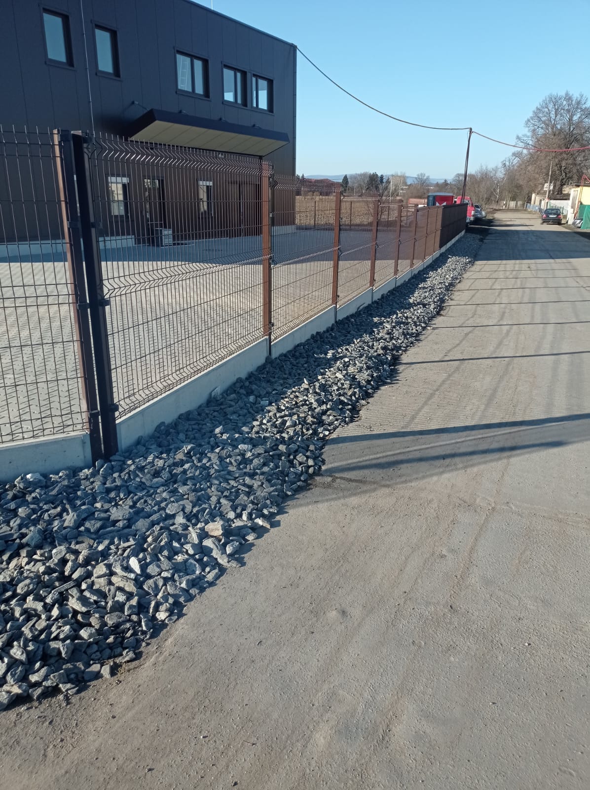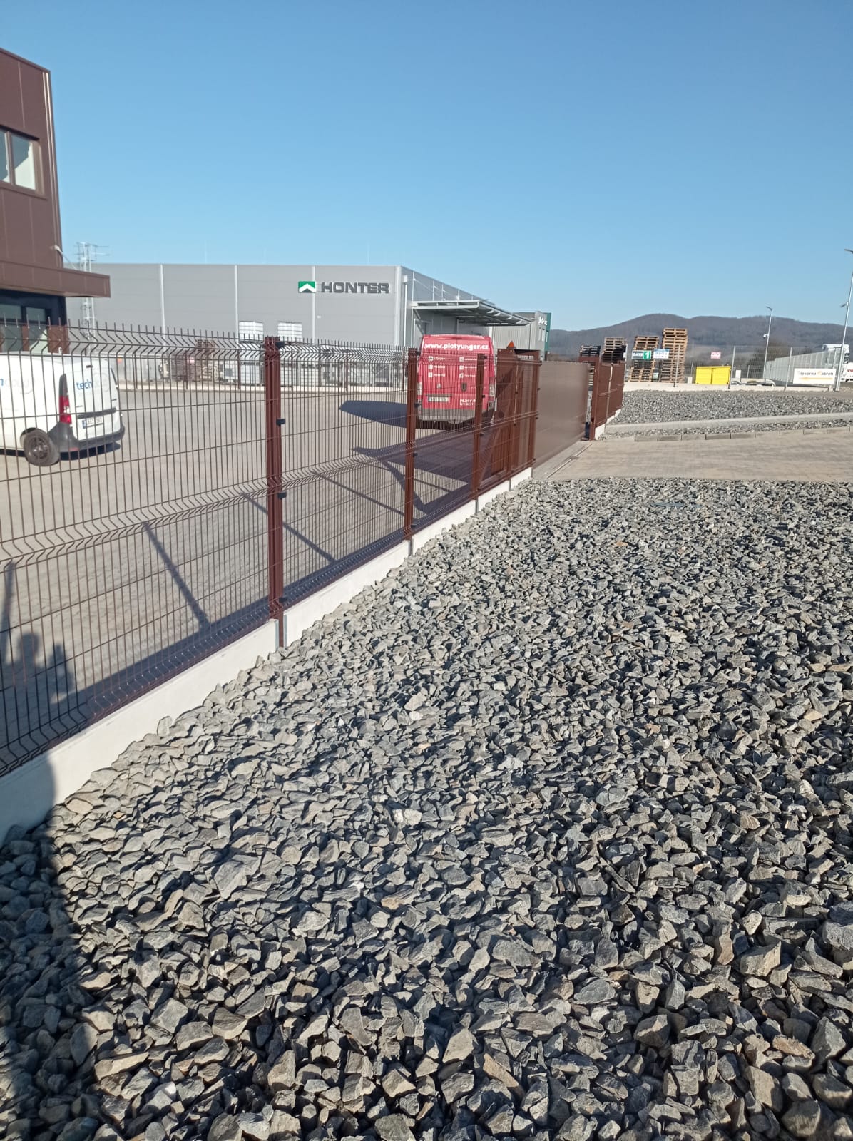 Oplocení svařovaným panelem 3D Classic výška 1530mmm v atipickém odsínu RAL 8017 . Automatická posuvná Brána 7500x1700 mm . Branka se sloupkem multibox.
